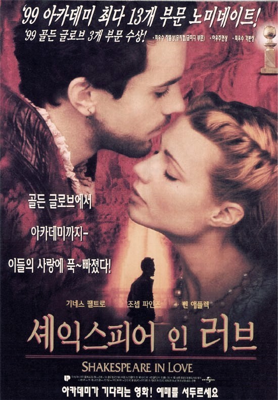 존 매든 감독이 연출한 영화 <셰익스피어 인 러브>는 1998년에 개봉했습니다. 이듬해 열린 아카데미 시상식에서 무려 13개 부분에 후보로 올랐고, 작품상을 비롯하여 7개나 되는 상을 휩쓸었습니다. 흥행에도 성공해 여우주연상을 받은 기네스 펠트로는 스토킹을 당할 정도였다고 합니다. 셰익스피어의 실제 이야기를 그리지는 않고 작가적 상상이 만들어낸 허구의 이야기이지만 상당 부분 사실을 토대로 만들어졌다고 하는 이 영화의 간단 줄거리를 살펴보겠습니다.