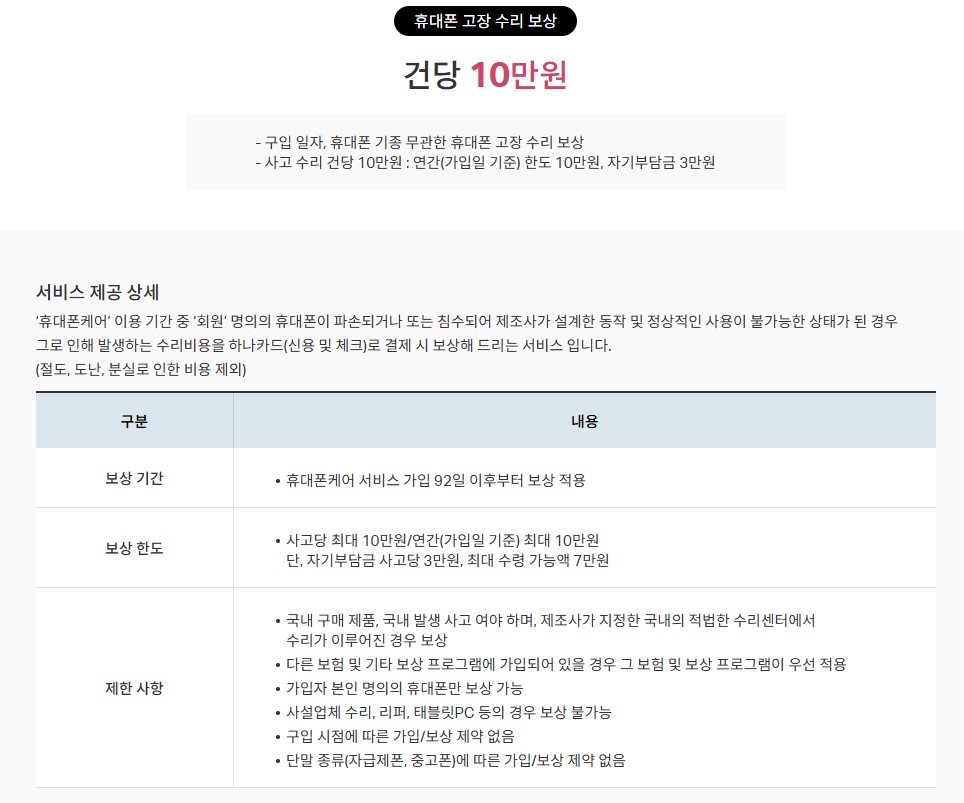 현대카드는 마이폰 서비스, 신한카드는 스마트폰케어 서비스, 하나카드는 휴대폰케어라는 이름으로 구독서비스를 제공하고 있습니다. 아래는 하나카드에서 제공하는 휴대폰케어 구독서비스 내용입니다.