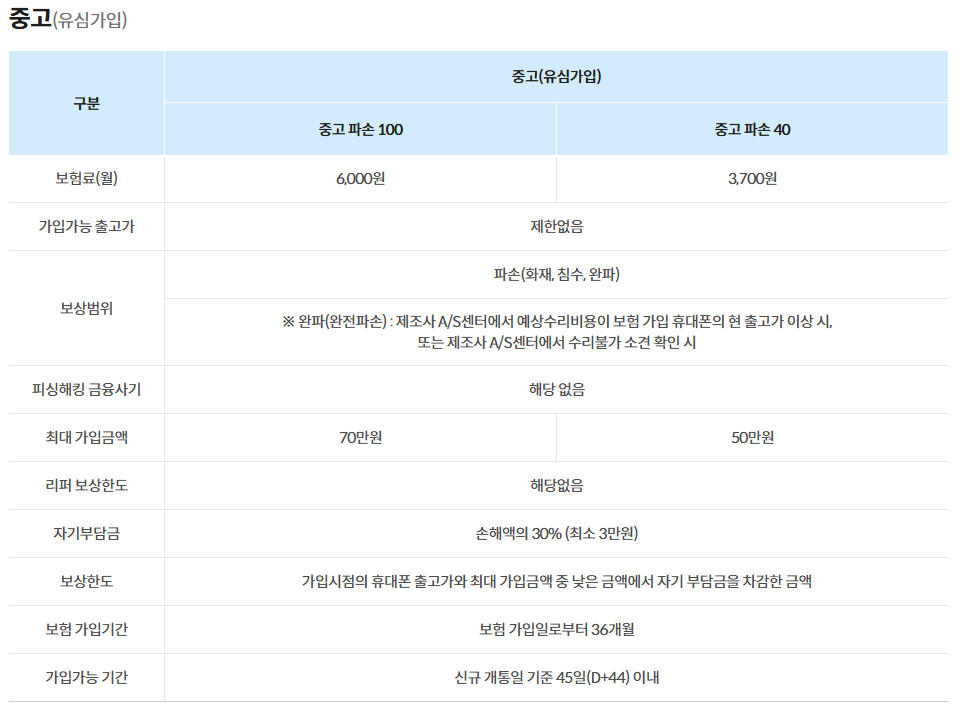 신규 개통일 기준 45일 이내의 어떤 중고폰이든 가입할 수 있다는 것도 장점이구요. 화재, 침수, 완파 등 모든 파손에 관련된 사항에 대해 보상을 받을 수 있습니다.